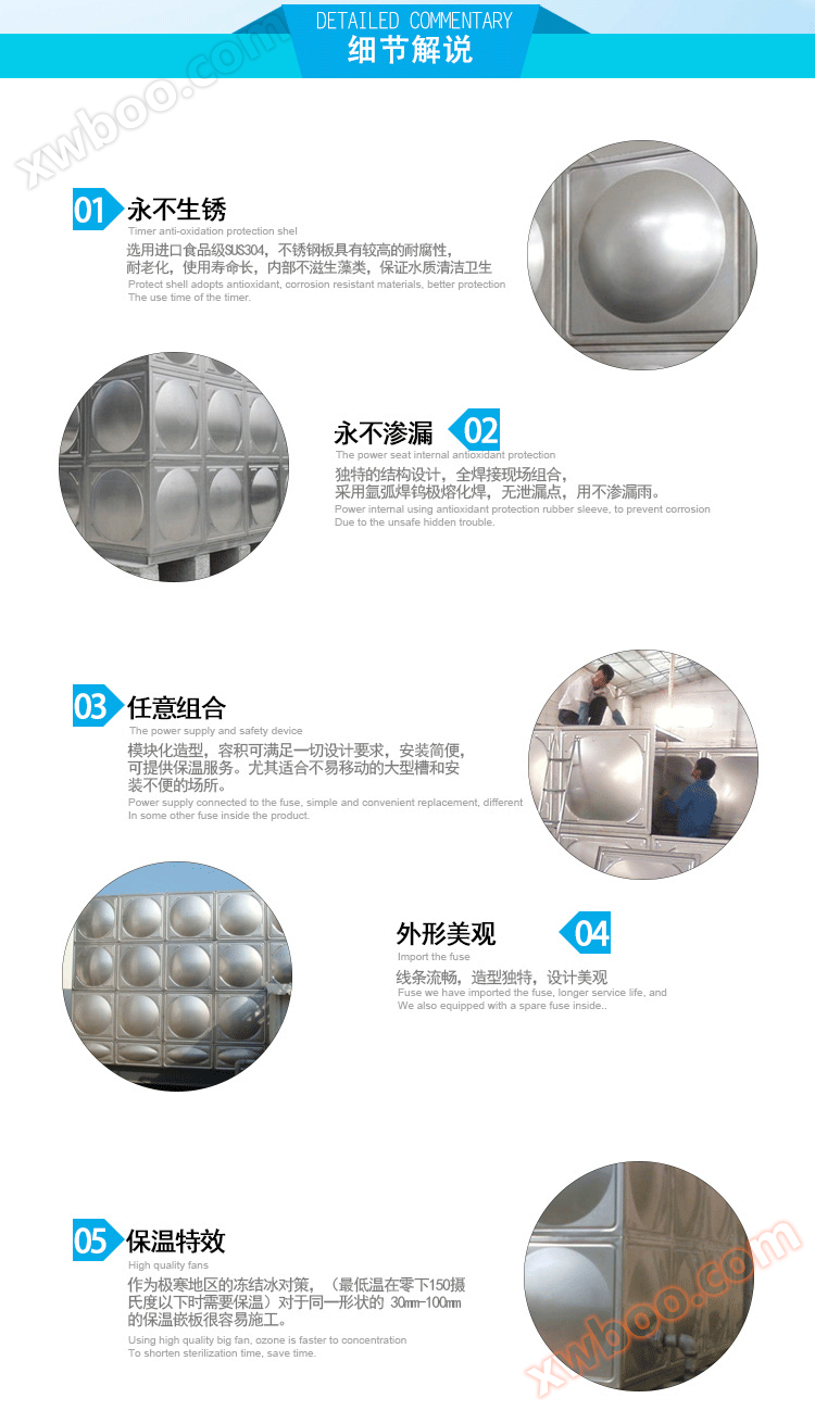 فولاد ضد زنگمخزن آبنسل جدید محصولات مخزن آب پس از مخزن فولادی شیشه ای است، محصولات آن از فولاد ضد زنگ SUS304 با قالب بندی دقیق ساخته شده است، سبک زیبا، اقتصادی و عملی، بدن اصلی برای مدت طولانی بد نیست.مخزن فولاد ضد زنگبا دیگرانمخزن آبدر مقایسه، دارای وزن سبک، مقاومت بالا، مقاومت در برابر خوردگی، مقاومت در برابر دمای بالا، تمیز کردن کیفیت آب، ضد نفوذ، مقاومت در برابر زلزله، هرگز گل، کیفیت آب بدون آلودگی ثانویه، نصب آسان، بدون نیاز به تعمیر و نگهداری، آسان برای تمیز کردن و مزایای دیگر است.